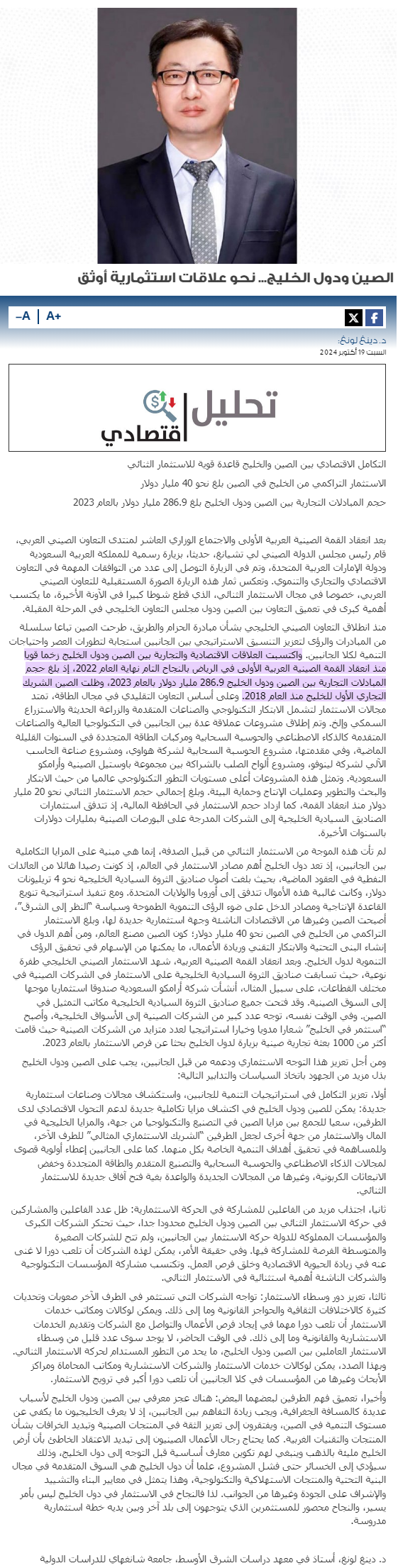 2024年10月19日,上外中东研究所丁隆教授在巴林《祖国报》发表评论文章“中国与海湾国家迈向更密切的投资关系”(见《祖国报》2024年10月19日第12版),全文如下: