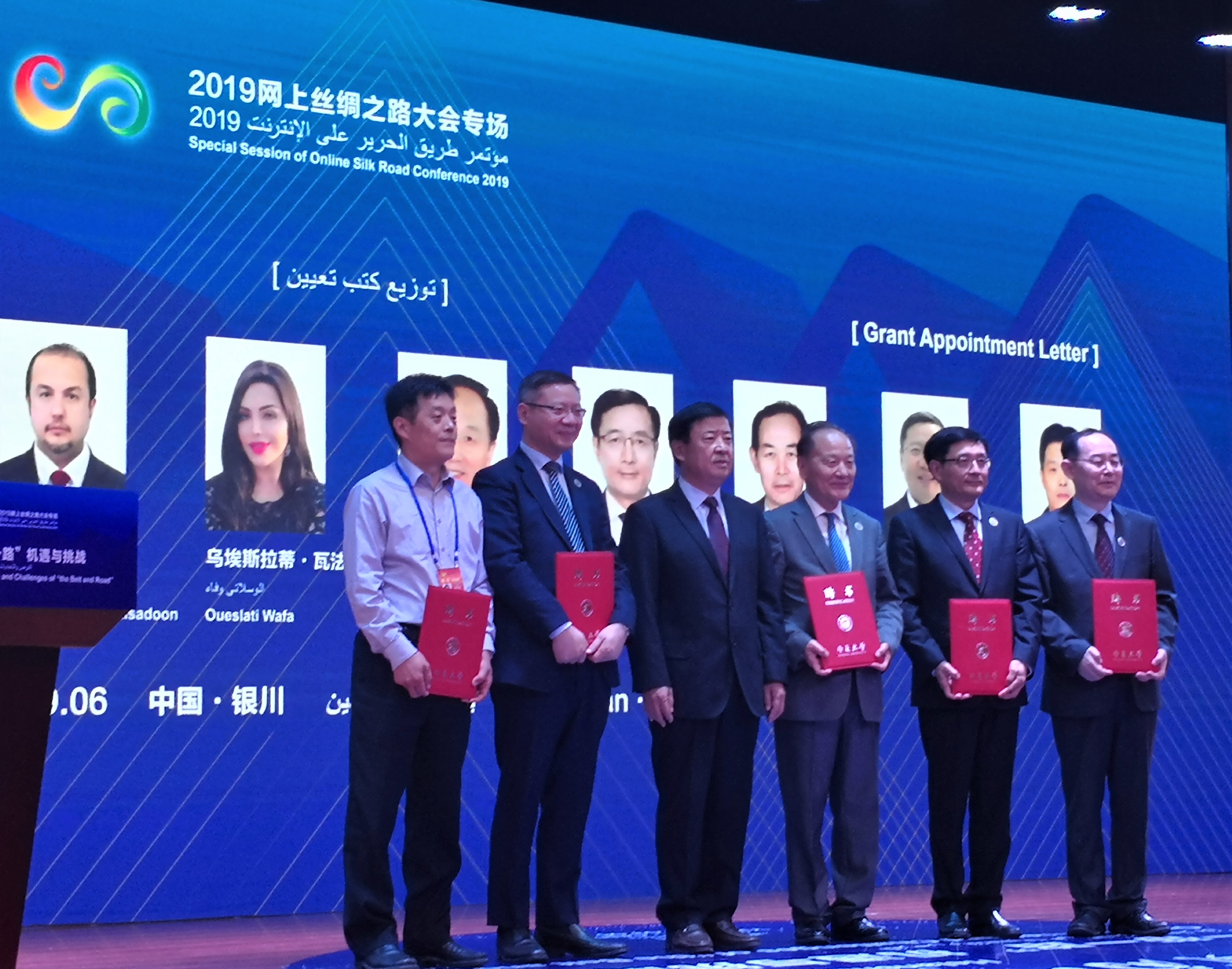 9月6日上午,专家学者代表团一行在宁夏大学参加中阿博览会的专题活动——“2019网上丝绸之路大会”,并被宁夏大学聘为兼职教授。在宁夏大学期间,刘中民教授还与宁夏大学中国阿拉伯研究院院长李绍先研究员、党委书记张前进教授以及上外校友金忠杰教授进行了广泛交流。