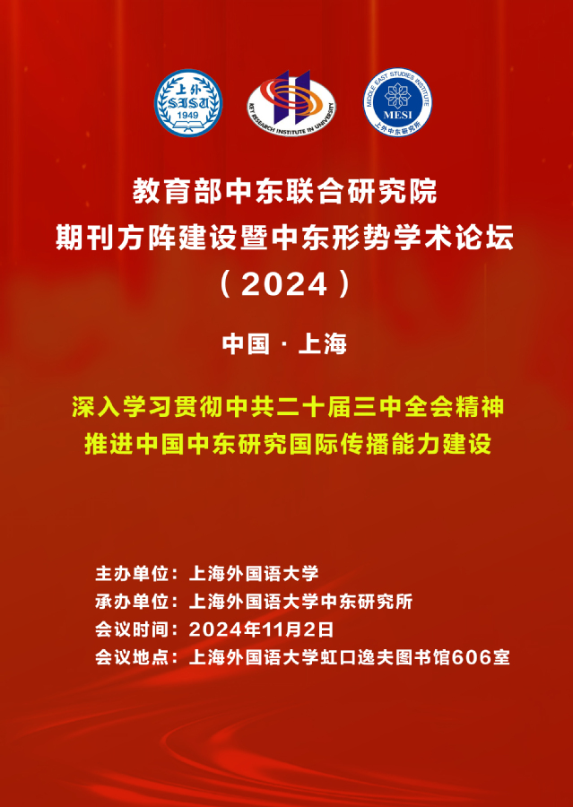 上海外国语大学中东研究所将于2024年11月2日(星期六)举办“教育部中东联合研究院期刊方阵建设暨中东形势学术论坛(2024)”,论坛主题为“深入学习贯彻中共二十届三中全会精神 推进中国中东研究国际传播能力建设”。