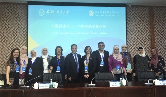 2019年10月20日上午,上外中东研究所丁俊教授应邀为中阿改革发展研究中心第九期阿拉伯国家官员研修班作了题为“中国的民族宗教政策”的专题讲座,讲座结束后与研修班官员进行了交流互动,并解答了官员们提出的问题。本期研修班由来自阿拉伯叙利亚共和国29名官员组成。交流中,官员们对中国的民族宗教政策表示赞赏,对中国在民族宗教事务管理领域取得的成就表示钦佩,并认为相关领域的中国经验对叙利亚国家重建具有重要借鉴价值。中阿改革发展研究中心由中国国家主席习近平亲自倡议成立,由中国外交部、教育部和上海市人民政府共同主办、上海外国语大学承办,中心自2017年成立以来已成功举办8期研修班,在推进中阿双方在治国理政经验交流方面发挥了重要作用,取得了很好的成效。