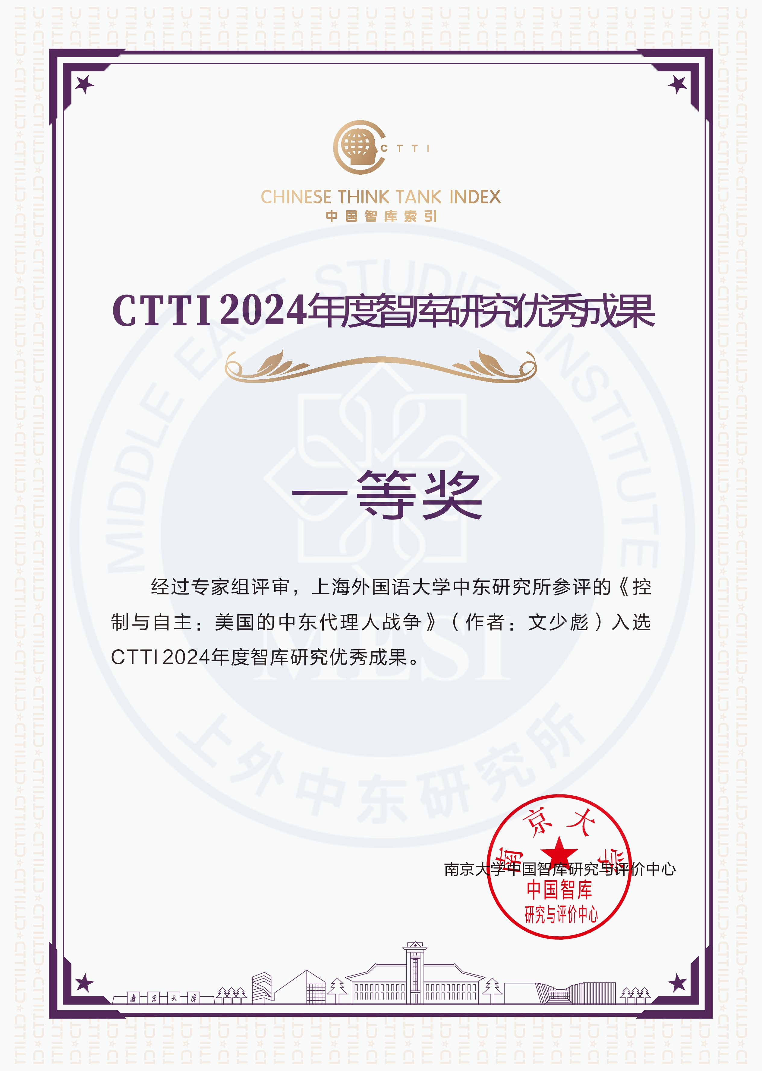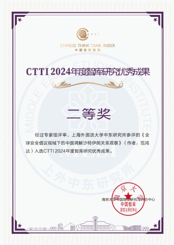 CTTI智库研究优秀成果是指近两年内,各申报单位在发挥咨政建言、理论创新、舆论引导、社会服务、公共外交等智库功能的过程中形成并产生一定影响的研究报告、内参、图书、学术论文、报纸文章等智库研究成果。在发布的2024CTTI智库研究优秀成果信息中,上海外国语大学中东研究所申报的专著《控制与自主:美国的中东代理人战争》(作者:文少彪)荣获一等奖,论文《全球安全倡议视域下的中国调解沙特伊朗关系观察》(作者:范鸿达)荣获二等奖。