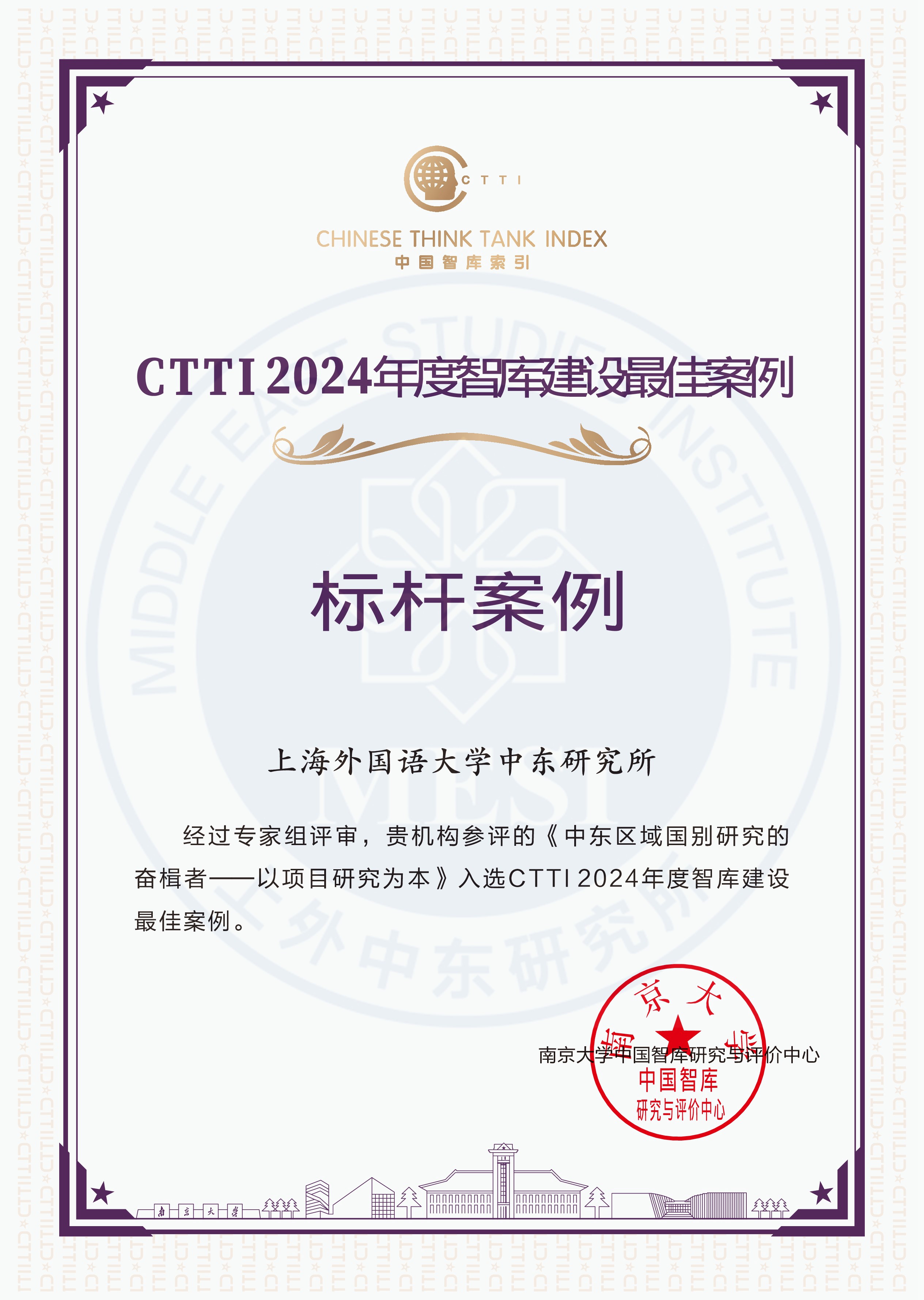 CTTI智库建设最佳案例是指各申报单位在实体建设与运营过程中为切实提高服务决策的能力水平,在制度建设、体制创新、运营管理等方面形成的建设案例与先进经验。经过初审和专家委员会终审,入围2024CTTI智库建设最佳案例的数量分别为标杆案例20份、示范案例45份、优秀案例94份。上海外国语大学中东研究所申报的《中东区域国别研究的奋楫者——以项目研究为本》入围标杆案例。