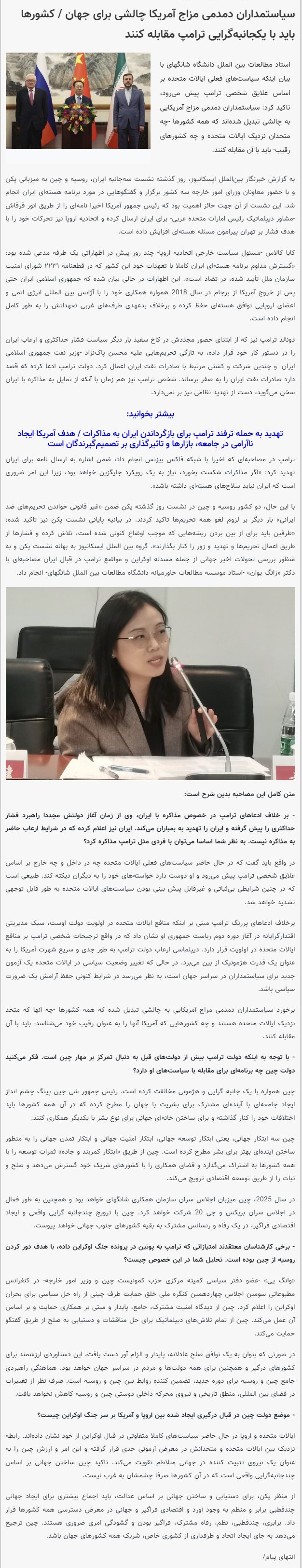 2025年3月16日,上外中东研究所章远研究员就中俄伊北京会晤接受伊朗ISCA通讯社专访,全文如下: