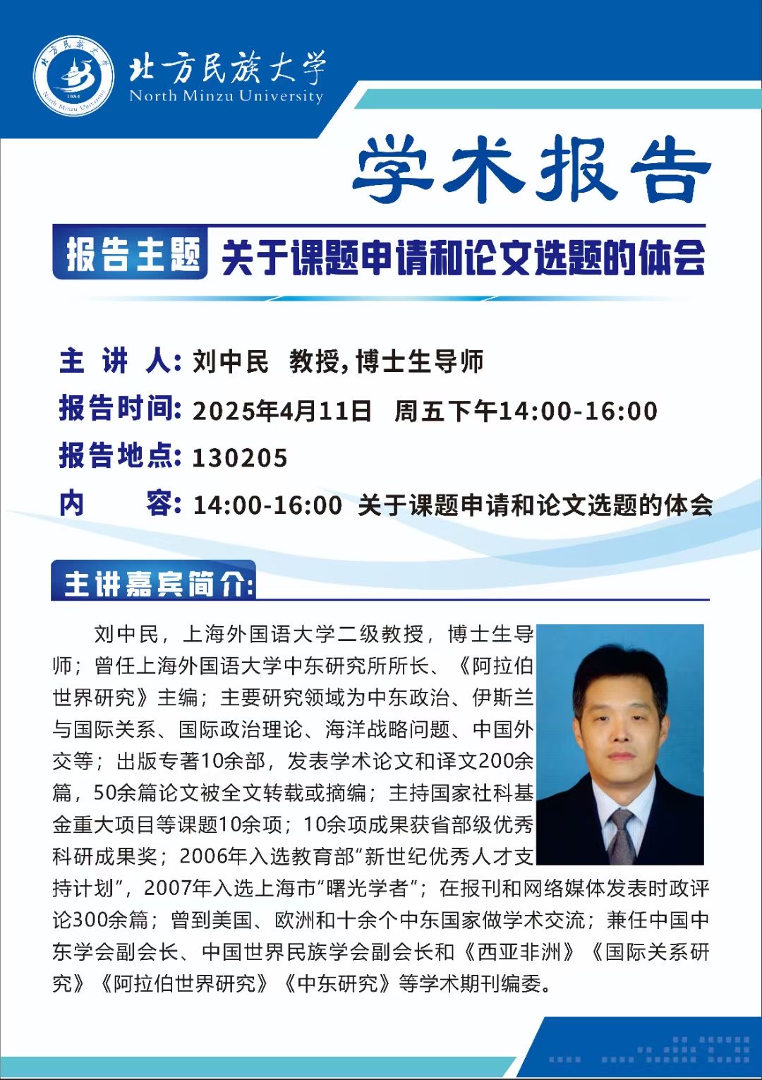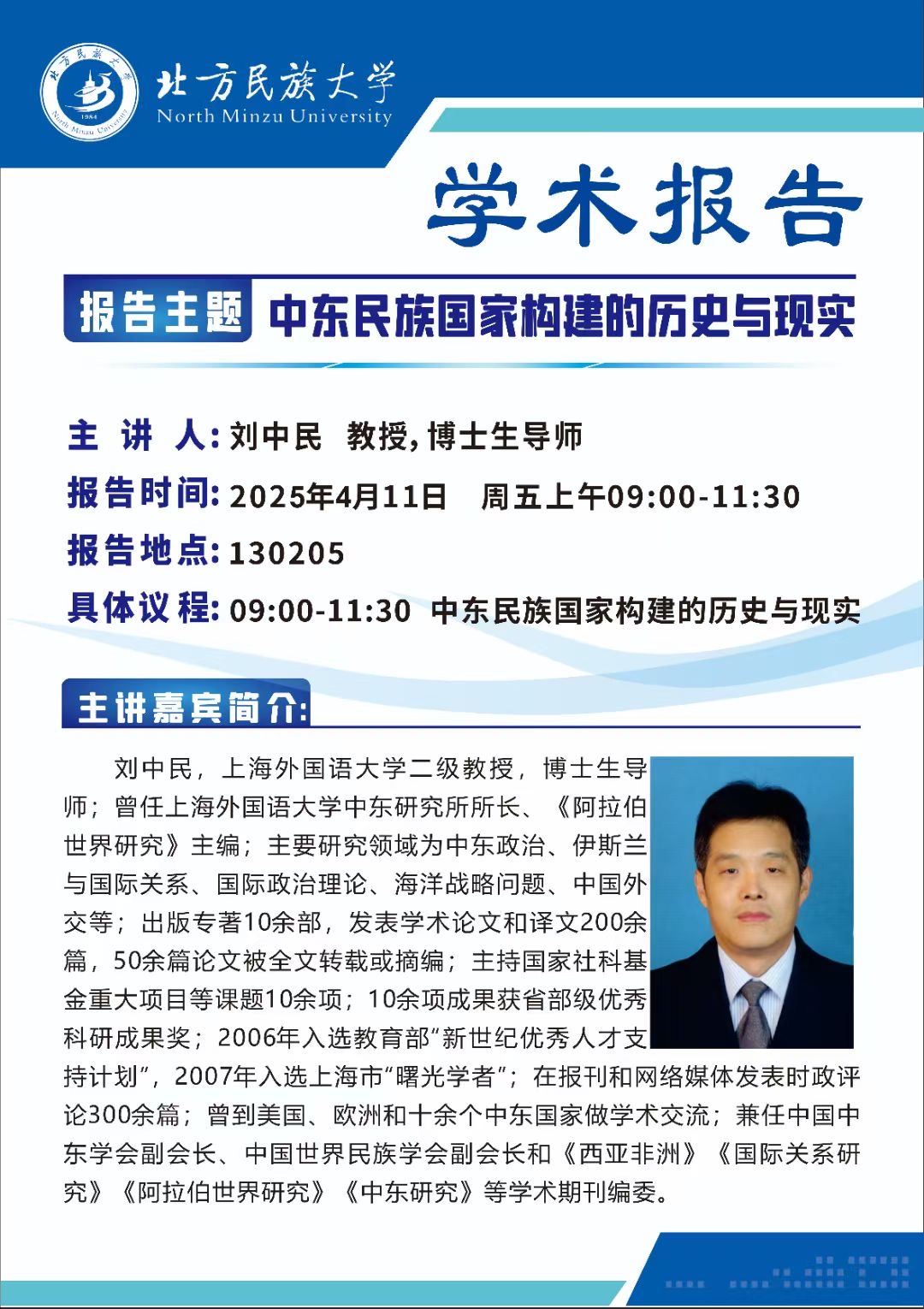 2025年4月10日至11日,上外中东研究所刘中民教授应邀赴北方民族大学进行学术交流,并为北方民族大学外国语学院师生作两场学术讲座。