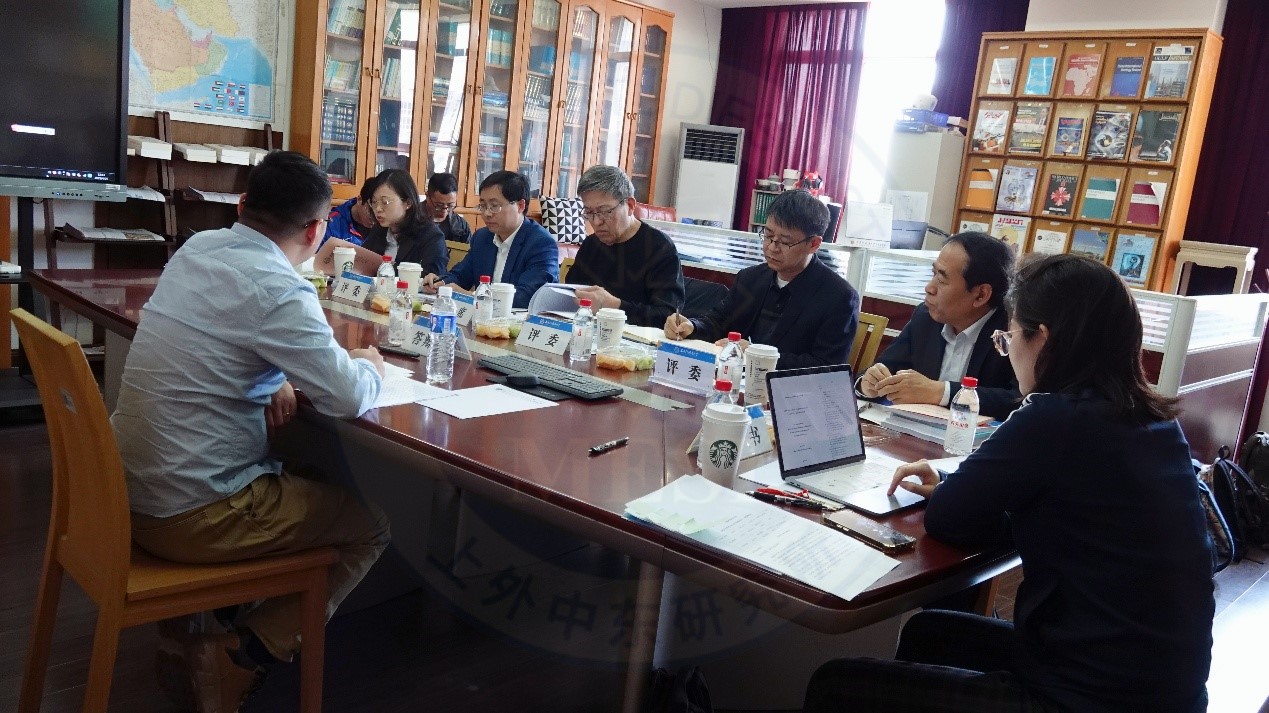 第二分会场设在科研楼804资料室,上海国际问题研究院李伟建研究员担任预答辩委员会主席,评审组由复旦大学中东研究中心孙德刚研究员、上外中东研究所丁俊教授、章远研究员、潜旭明副研究员组成,对黄沛韬、赵成、王丹钰、李雪妍、孙杰5位博士候选人的学位论文进行评议,甄诚同学担任答辩秘书。
