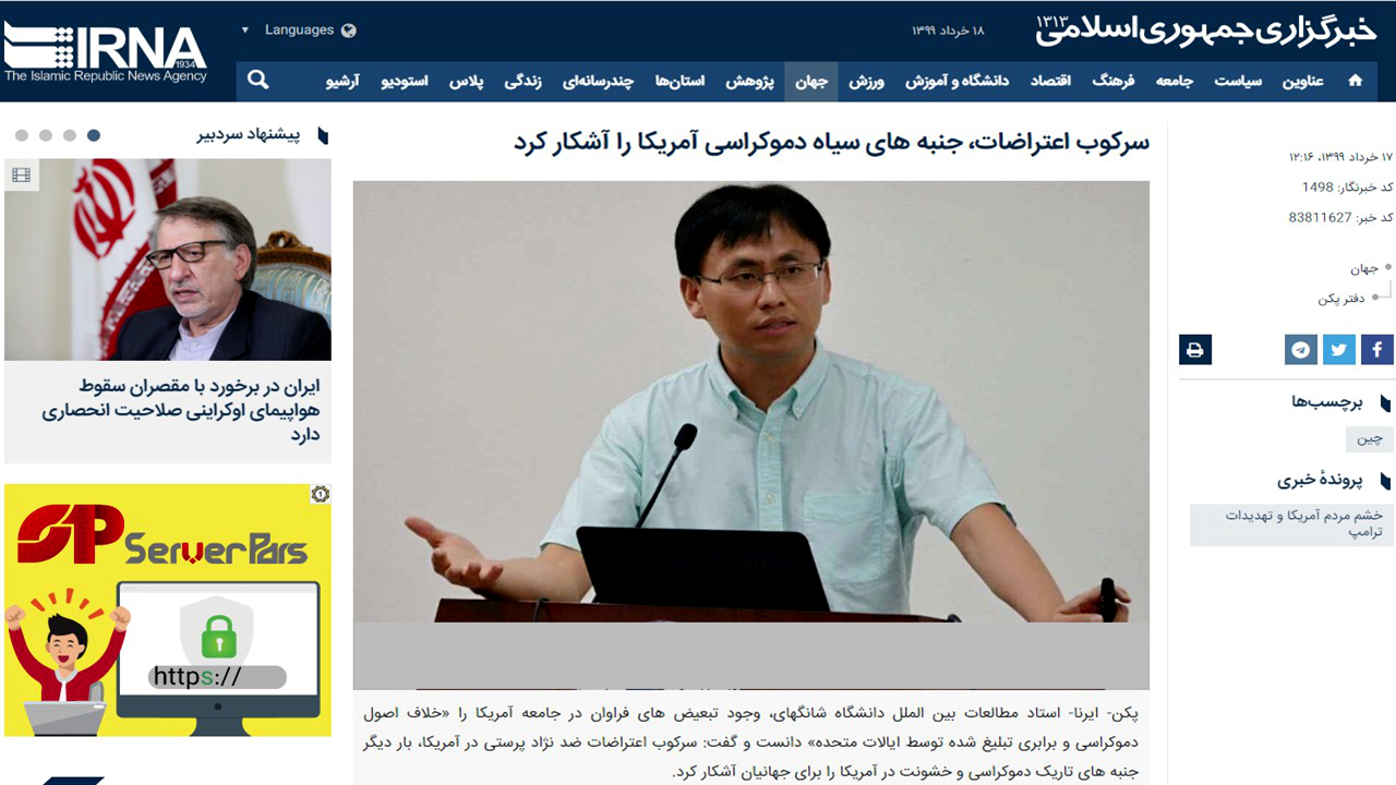 2020年6月6日,上外中东研究所范鸿达教授就美国的反种族主义抗议事件接受伊朗国家通讯社(IRNA-Islamic Republic News Agency)专访。