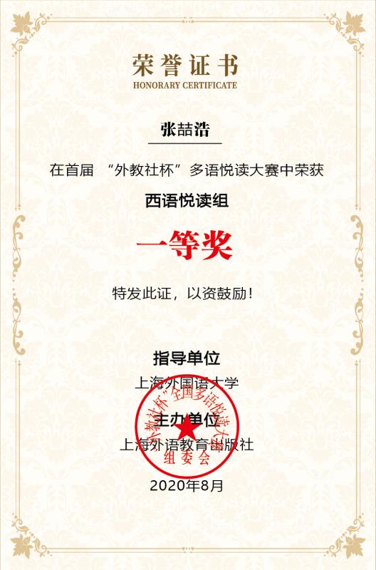 近日,在首届外教社杯多语悦读大赛中,上海外国语大学西方语系西班牙语专业2019级学生张喆浩荣获一等奖。此外,我系2017届西班牙语专业校友朱雷获得二等奖。