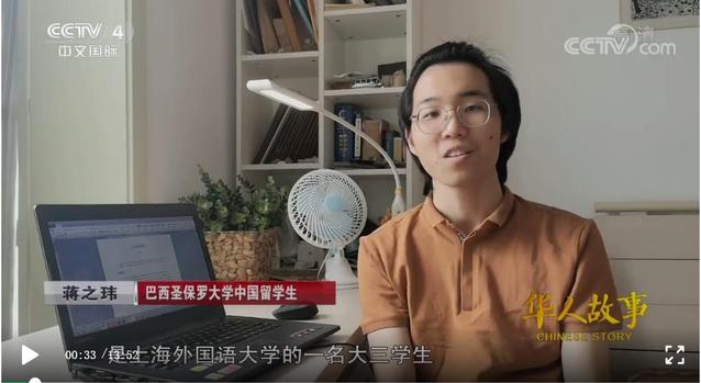 2020年,新冠疫情在全球肆虐,巴西的感染和死亡人数也日益增加。CCTV华人故事专栏针对巴西疫情期间留学生的学习和生活,于6月至7月间对正在圣保罗大学交换学习的西方语系葡萄牙语专业17级学生蒋之玮进行跟踪采访,制作了节目,并于8月15日在全球范围内播出。