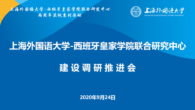2020年9月24日下午,上海外国语大学-西班牙皇家学院(RAE-SISU)联合研究中心建设调研推进会在松江校区实体中心召开。校长李岩松出席会议,校长办公室主任兼语言研究院党总支书记蒋昕宇、对外合作交流处处长张红玲、科研处处长王有勇、对外合作交流处副处长王征、西方语系主任于漫、系党总支书记施海倩、系副主任杨明、西班牙语专业教研室主任曹羽菲等参加会议。