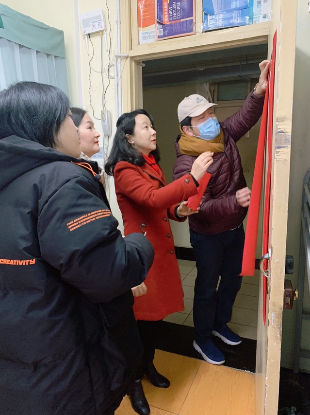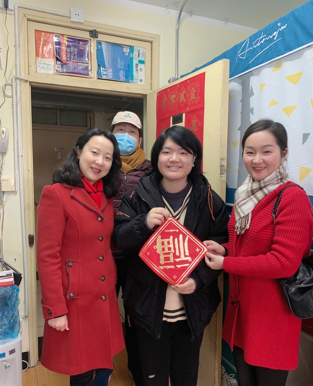 2021年2月12日大年初一上午,西方语系党总支书记施海倩、副系主任杨明、党总支副书记张敏、办公室主任赖小婵一行前往松江校区学生宿舍,代表西方语系领导班子和全体教师,看望慰问因疫情原因选择留校过年的学生,与学生一切贴春联,在新年第一天为留校学生送去节日问候和暖心祝福。