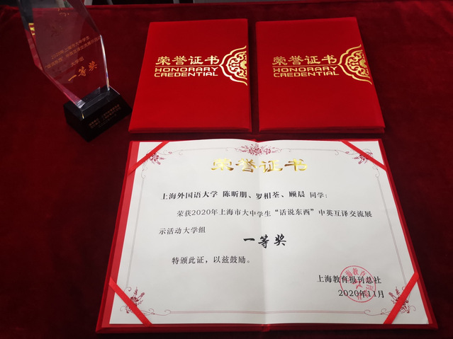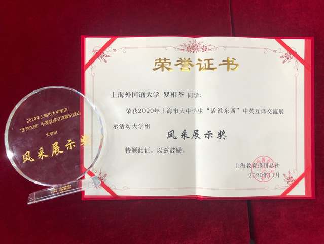 202012月13日,罗相荃同学还曾搭档英语学院的顾晨陈昕朋同学,代表上海外国语大学参加2020年上海市大中学生“话说东西”中英互译交流展示活动,荣获大学组第一名。作为外方主持人的罗相荃同学提问既有深度、又有温度博得了现场评委和观众的阵阵掌声,还荣获了风采展示奖。现场评委表示,选手从主题思想、语言功底、个人风采以及学校组织等多个层面向观众们展示了当代青年学生的风采,特别在主题思想方面,他们通过主题内容的选择很好地讲述了“中国故事”,在人类命运共同体的大背景下,向全世界介绍了中国所取得的成就。