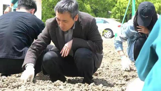 接着,在农业专家的耐心指导下,教工党员们分工合作,下地参与劳动。先用锄头开垦出一道道待播种的坑道,确保种子可以笔直排列;再一粒一粒疏密有序地排列种子,防止发芽生根后根茎相互缠绕;然后将坑道两侧的土壤推埋填平,确保种子距离地面位置约2公分,若过深或过浅都会影响种子吸收养分而导致无法健康生长;同时要捏碎泥土块,拣除大石块,避免对发芽后破土而出的树苗造成阻碍和损伤。全系教工党员协作完成了南7、南8、北7、北8四块田地的棉花播种。
