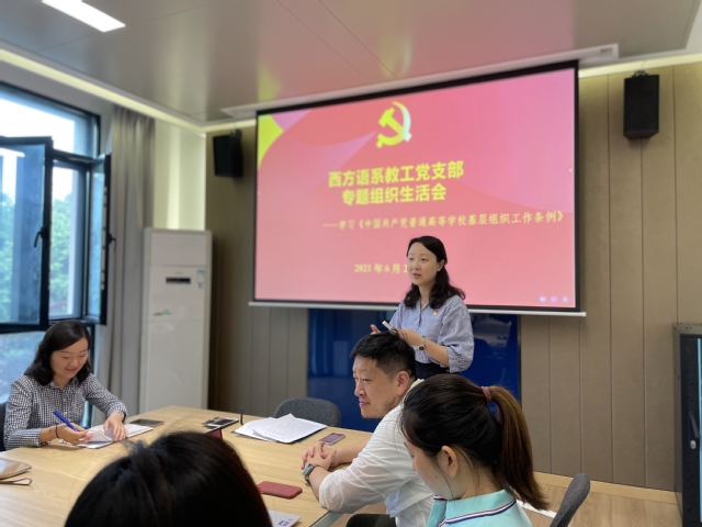 62日,西方语系教工党支部召开学习《中国共产党普通高等学校基层组织工作条例》专题组织生活会。教工党支部全体党员和学生党支部代表参会。会上,党总支书记施海倩同志就条例的具体内容开展领学,并与大家分享了学习体会与收获。