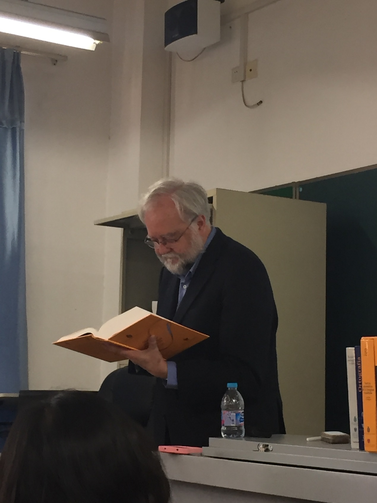 上午的讲座题为“西班牙语语法中的各种反身问题”。博斯克教授通过多个例句,分析了西班牙语中常见的反身现象。他提醒未来的西班牙语研究者,语法研究中的一切都是细微的,需要逐步细致地分析句子之间的差异;不能拘泥于术语和名称,需要重视的是语言现象本身。