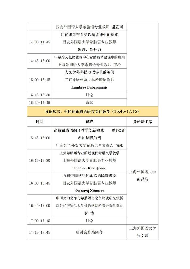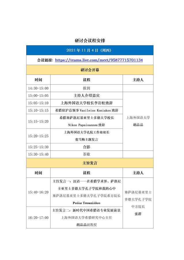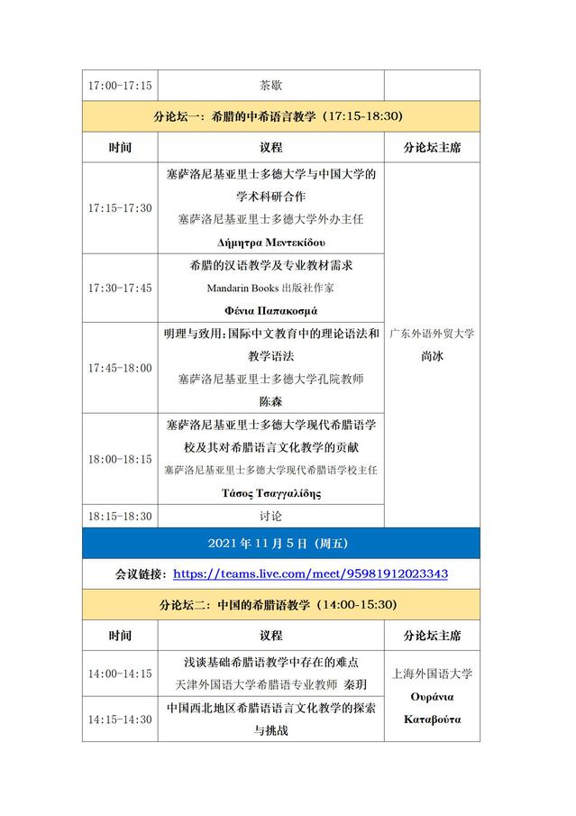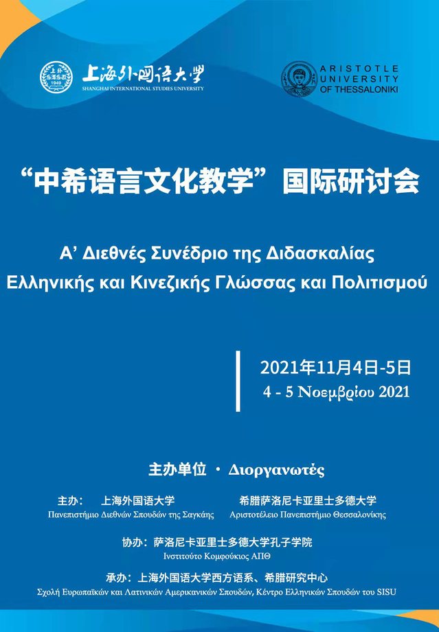 习近平总书记在2019年访问希腊期间提出要全面提升中希两国的战略关系,加强文化的交流互鉴,向全世界展示伟大古老文明的和合之美。深化推进两国的交流和合作需要一大批熟悉中国和希腊国情文化、具有全球视野、熟练运用汉语和希腊语的专业人才。2021年是中希旅游文化年,两国也因一带一路战略的推进而合作日益密切,对精通希腊语和汉语人才的需求更加迫切也更加多样化。为了加强中国与希腊语言文化教学同行的交流与合作,总结和分享优秀的教学经验,研讨助力中希交流的人才培养模式,上海外国语大学将于2021114-5日举办中希语言文化教学国际研讨会(线上+线下相结合)。会议由上海外国语大学和塞萨洛尼基亚里士多德大学共同主办,塞萨洛尼基亚里士多德大学孔子学院、上海外国语大学西方语系、上海外国语大学希腊研究中心承办,会议具体安排如下: