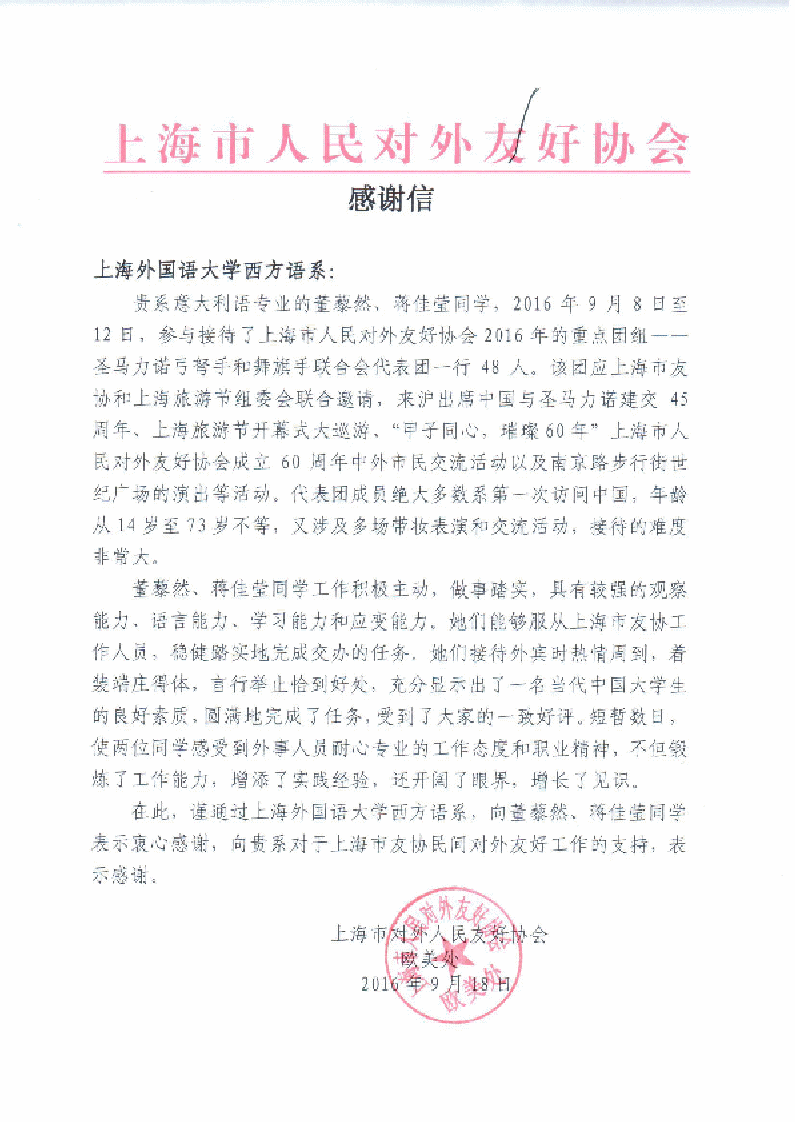 201698日至12日,经西方语系精心选拔和组织,选派意大利语专业董藜然、蒋佳莹同学参与“甲子同心、璀璨60年”上海市人民政府对外友好协会成立60周年中外市民交流活动。我校西方语系学生参与接待了上海市人民对外友好协会2016年的重点团组——圣马力诺弓弩手和舞旗手联合代表团一行48人,圆满完成上海市旅游节开幕式大巡游的接待和组织工作。学生们过硬的语言功底,较强的综合素质,受到上海市人民对外友好协会的好评。近日,我校收到上海市人民对外友好协会的致谢函,信中对于意大利语专业学生志愿者们的出色服务、西方语系对上海市友协民间对外友好工作的支持,表示了衷心感谢。(西方语系)