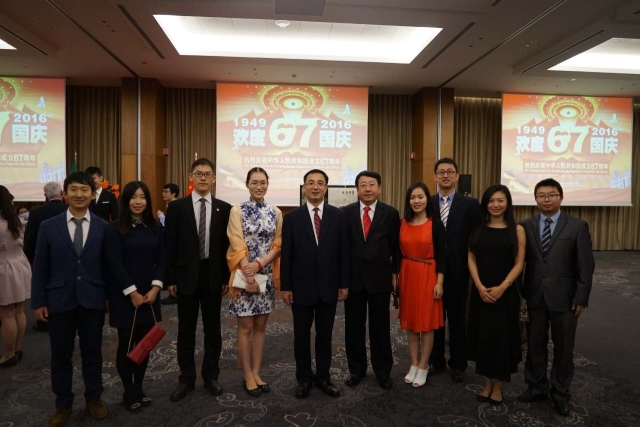 (参与接待的留学生参加大使馆国庆招待会,左五为中国驻葡萄牙大使蔡润,左四为蒋李俐)