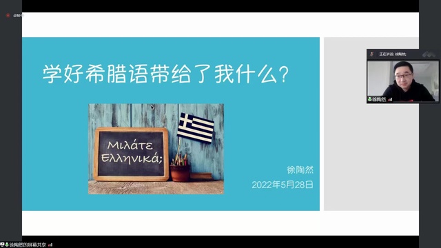 徐陶然坦言,他在最早开始学习希腊语时也遇到了不少困难。万事开头难,要有克服困难的信心;更要有勇于和希腊人交流的信心。从“学会”希腊语到“学好”希腊语,是一个质的飞跃。语言是传递信息的工具,而语言的学习是永无止境的。在打好坚实的基础后,更好掌握希腊语的重点就在于了解其地道的文化背景与微妙细节。这些建议对希腊语专业的学生来说是一种“强心剂”,是更好学习希腊语的有效方法。徐陶然也分享了他在校时为毕业所做的准备,即阅读时政类文章,参与学生会工作,加强写作能力等,建议同学们在大学期间除了专业学习之外也应为踏上社会作出必要准备。在回顾自己的大学生涯时,徐陶然表示,刚刚进入大学的时候,自己对于未来的规划并不够清晰。若能重来,会搭建更完善的知识体系,珍惜所有翻译的机会,更努力去学会了解别人的想法、与更多的人交流,创建属于自己的资源整合平台。最后,徐陶然站在宏观角度展望希腊语的前景和未来。在信息大爆炸的时代,获得知识的途径越来越多,个体之间学习能力的竞争将越来越激烈。他鼓励同学们把希腊语学习作为节点,寻找联系,建立网络,成为有价值的人才。
