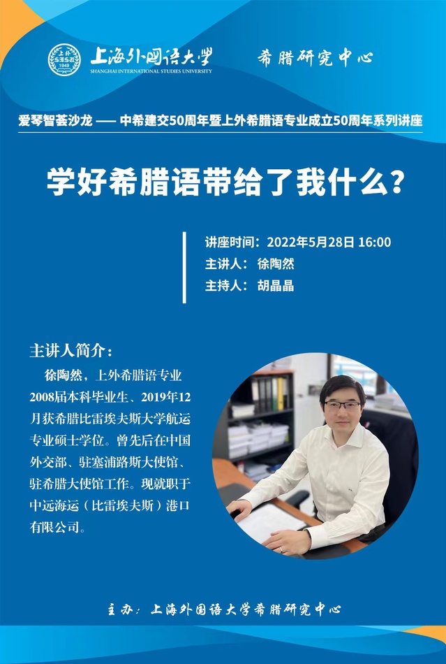 2022年5月28日,“爱琴智荟沙龙”——中希建交50周年暨上外希腊语专业成立50周年系列活动的第二场讲座拉开序幕。本场讲座邀请了上海外国语大学希腊语专业2008届本科毕业生徐陶然。徐陶然曾在中华人民共和国外交部任职八年,先后任职于驻塞浦路斯大使馆、驻希腊大使馆,现就职于中远海运比雷埃夫斯港口有限公司,期间在希腊比雷埃夫斯大学航运专业获得硕士学位。本次讲座以《学好希腊语带给了我什么》为题,由上外希腊研究中心主任胡晶晶副教授主持,希腊语专业全体师生均参与活动。