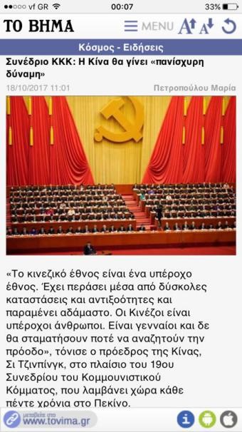 伴随着十九大的召开,希腊有多家媒体对此进行了跟踪报道。其中“中国力量、中国经济、中国特色社会主义新时代”作为关键词被希腊媒体重点关注。作为一名海外党员,我感到非常自豪与光荣,国外媒体对十九大的关注体现了中国在世界舞台上的地位不断提高,十九大不仅是中国政府和人民的大事情,也是全世界的大事情。