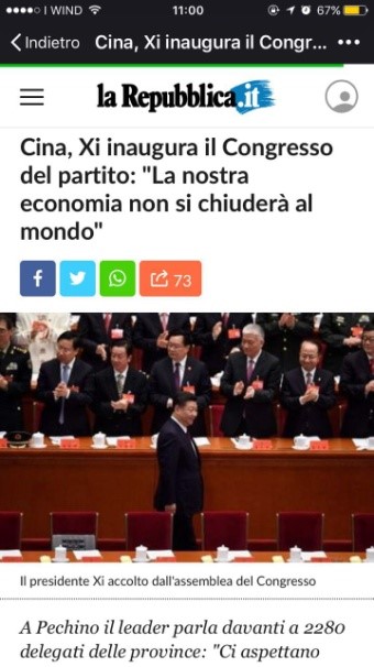 意大利有包括《共和国报》 、 《24小时太阳报》在内等四家主流媒体报纸报道了十九大,重点关注了中国的经济发展战略、与国际经济合作的前景以及中国政治体制的改革进程。作为海外党员我为祖国的繁荣强盛感到自豪,对祖国的国际地位日益提高感到骄傲。身在海外依然能感受到十九大的重大影响,证明了中国的国际影响力和大国形象。我也将会持续关注十九大以及其他国家大事,身虽在外,心系祖国。