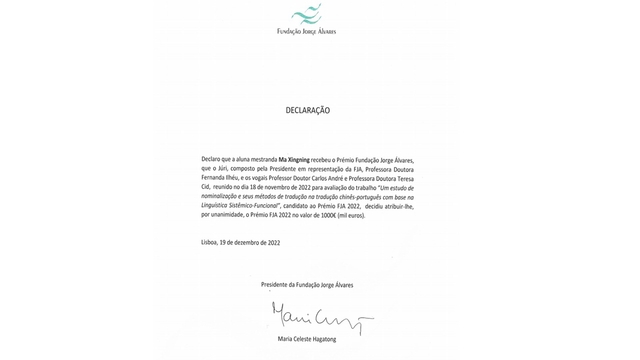 一年一度的欧维治基金会奖由欧维治基金会主办,参赛对象为就读葡萄牙或中国高等院校的硕士生和博士生。该奖旨在鼓励学生不断深化对中葡关系,包括语言、文化以及其他学科领域的研究,以推动两国深入开展各领域交流与合作。本届比赛设有三个研究方向,分别为:“葡萄牙语言和文化研究及其在亚洲的影响”“关于中国和葡语国家外商直接投资法律框架的比较研究”和“葡萄牙和中国在21世纪海上丝绸之路与粤港澳大湾区建设的合作机遇”。此次马星凝同学的参赛论文题为《系统功能语言学视角下名词化现象及其在汉葡双语中翻译方法的研究》,西方语系葡语教研室主任徐亦行担任其指导教师,由基金会理事与数位学术专家组成的评审委员会一致同意推举该篇论文为唯一的获奖论文。