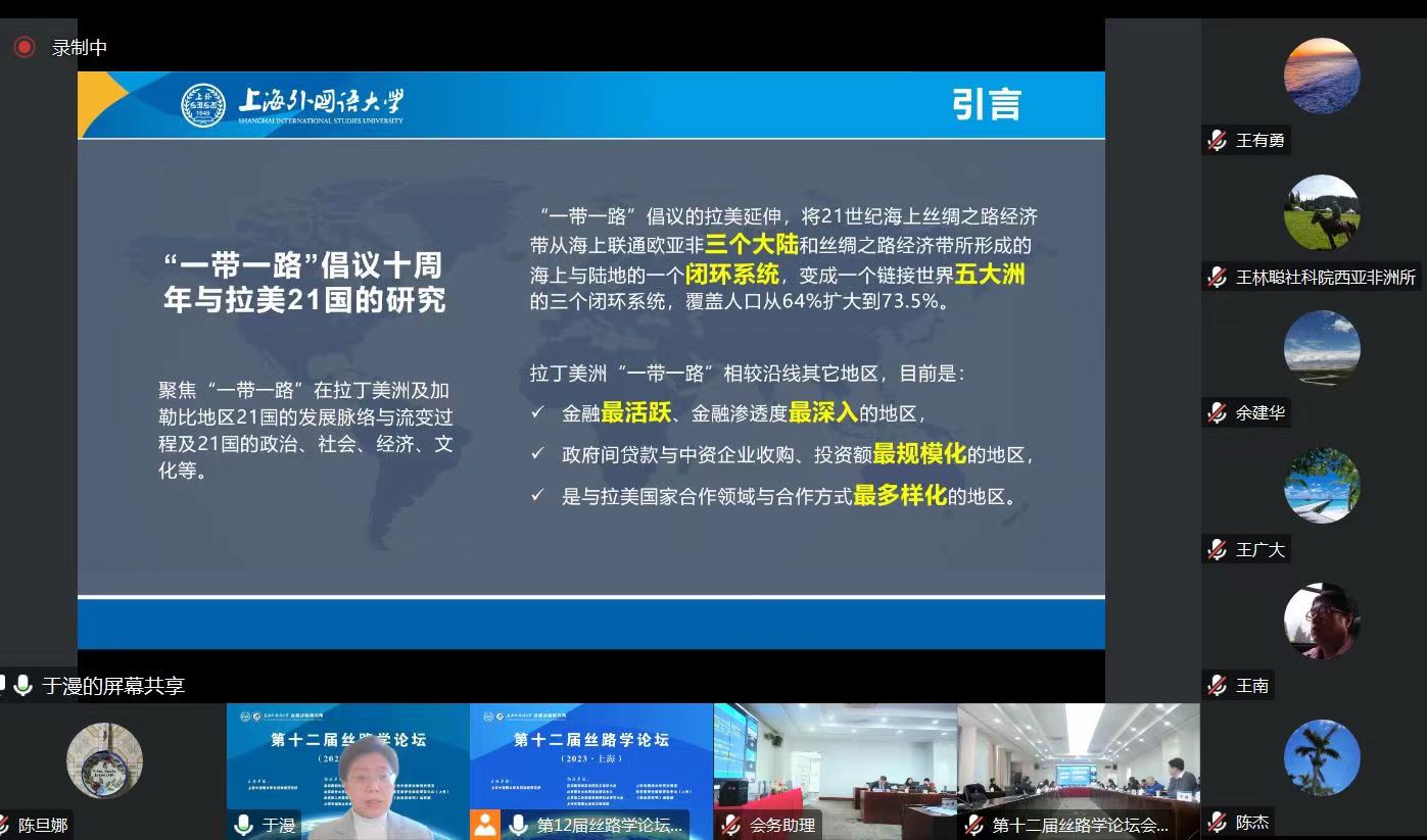 于漫教授发言题目为《“一带一路”倡议十周年与拉丁美洲》,从我国和拉美各国的外交关系出发,呈现“一带一路”在拉美延伸的进程,梳理中国与拉丁美洲各国签署的“一带一路”合作文件,阐释了广袤的拉丁美洲和加勒比地区加入“一带一路”合唱团的战略意义。发言认为,加入“一带一路”倡议有利于拉美国家走出发展困局,破除中拉合作阶段性难题,共同应对世界复杂局势变化。