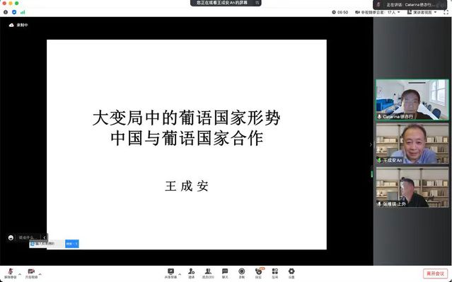 在讲座中,王成安教授从国际形势出发,提出当今世界正面临着区域性和全球性的经济、军事、政治、环境保护、医疗等方面的危机与挑战。尽管面临诸多挑战,葡语国家总体形势向好,呈现出在大变局中葡语国家追求和平发展的态势。具体来看,巴西、安哥拉、莫桑比克、东帝汶等葡语国家今年以来在国际、地区和国内事务中各有亮点;王成安教授列举中葡论坛、中国与葡语国家智库论坛、中国国家副主席韩正访葡、巴西总统卢拉访华等事例,生动诠释了近年来中国与葡语国家在各方面开展的积极合作。