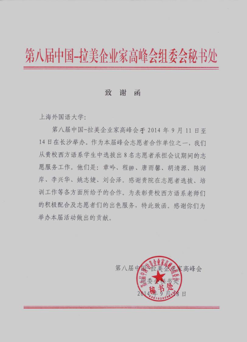 9月11日至14日,第八届中国—拉美企业家高峰会在湖南长沙成功落幕,我校西方语系组织并派出8名西班牙语专业学生提供志愿服务,圆满完成任务,学生们过硬的语言功底,较强的综合素质,受到组委会的好评。近日,我校收到第八届中国-拉美企业家高峰会组委会发来的致谢函,信中对于西班牙语专业学生志愿者们的出色服务、西方语系老师的认真组织与积极配合,表示了衷心的感谢。