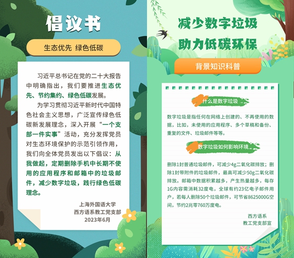 党的十八大以来,党中央以前所未有的力度抓生态文明建设,美丽中国建设迈出重大步伐,我国生态环境保护发生历史性、转折性、全局性变化。习近平总书记在党的二十大报告中明确指出,我们要推进生态优先、节约集约、绿色低碳发展。为深入学习贯彻习近平新时代中国特色社会主义思想,广泛宣传绿色低碳新发展理念,积极开展绿色低碳引领活动,充分发挥党员对生态环境保护的示范引领作用,西方语系教工党支部向全体党员发出倡议:“从我做起,定期删除手机中长期不使用的应用程序和邮箱中的垃圾邮件,减少数字垃圾,践行绿色低碳理念。”
