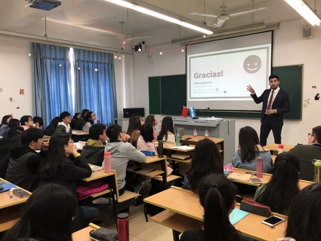 3月26日,阿根廷布宜诺斯艾利斯国会议员、阿根廷劳工联合总会(CGT)的文化、科学和技术秘书,以及阿尔瓦拉多体育俱乐部的副主席Facundo Moyano一行访问上外松江校区,为西班牙语本科生及硕士生做题为“拉美就业与新技术”的讲座。Moyano议员一行此次来访加深了我系学生对拉美国情文化的了解,有效推动了西语学科的建设。