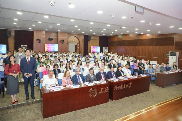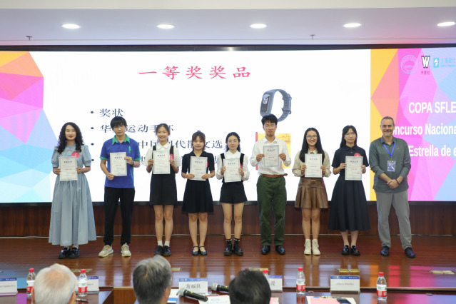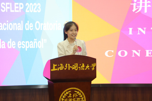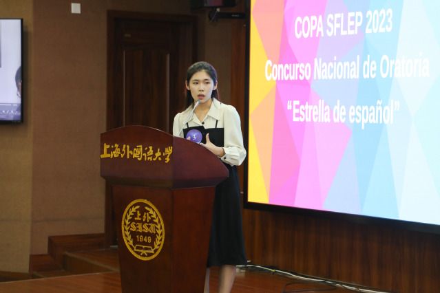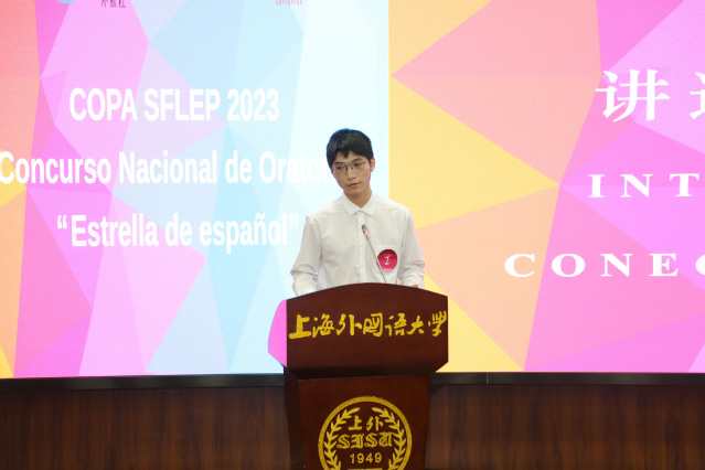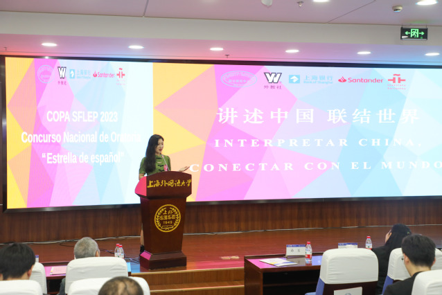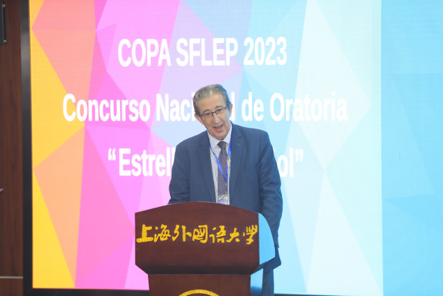 2023年9月15日,2023年外教社杯“讲述中国,联结世界”全国西班牙语之星演讲大赛决赛在上海外国语大学松江校区落下帷幕。上海外国语大学校长李岩松、西班牙皇家学院前院长Darío Villanueva院士、西班牙驻沪总领馆总领事Luis A. Calvo Castaño先生及夫人María José Carrasco女士、秘鲁驻沪总领馆总领事David Guillermo Gamarra Silva先生、古巴驻沪总领馆总领事Mileidy Aguirre Diaz女士、桑坦德咨询(北京)有限公司执行董事汤懿敏、上海塞万提斯图书馆馆长Inma González Puy女士及学术部主任Alberto Sánchez先生、北京外国语大学西班牙语葡萄牙语学院院长常福良教授、上海外语教育出版社社长孙玉、上外教务处、教材处处长、国际教育学院院长金慧教授、上海外国语大学西方语系系主任于漫教授、西方语系党委书记施海倩以及来自全国各高校西语专业的师生代表参与观赛。