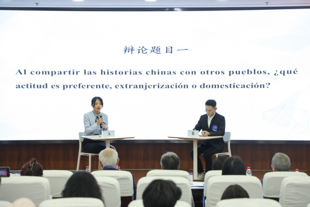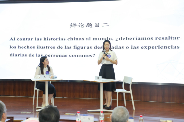 全国78所院校的866名选手报名参加本次大赛。经过初赛的激烈角逐,低年级组12名选手和高年级组12名选手入围决赛。决赛阶段由西班牙皇家学院前院长Darío Villanueva院士、西班牙驻沪总领馆总领事Luis A. Calvo Castaño先生、秘鲁驻沪总领馆总领事David Guillermo Camarra Silva先生、古巴驻沪总领馆总领事Mileidy Aguirre Diaz女士、教育部高等学校外国语言文学类专业教学指导委员会西班牙语专业教学指导分委员会主任委员、北京外国语大学西葡语学院院长常福良教授、教育部高等学校外国语言文学类专业教学指导委员会西班牙语专业教学指导分委员会副主任委员、上海外国语大学西方语系系主任于漫教授以及上海塞万提斯图书馆学术部主任Alberto Sánchez先生担任评委。低年级组选手们在决赛中就“中国青年力量”进行命题演讲并现场回答评委提问,展现出卓越的西班牙语水平和演讲才华。高年级组的竞争则更为激烈,经过第一轮命题演讲环节,八位选手成功晋级第二轮,就讲述中国故事“使用归化还是异化策略”以及“突出名人事迹,还是强调身边故事”等话题展开一对一辩论,最终四位选手脱颖而出,进入第三轮,通过观看短视频后的即兴演讲,展现出出色的临场应变能力。选手们在赛场上的精彩表现不时赢得观众的阵阵喝彩和掌声。