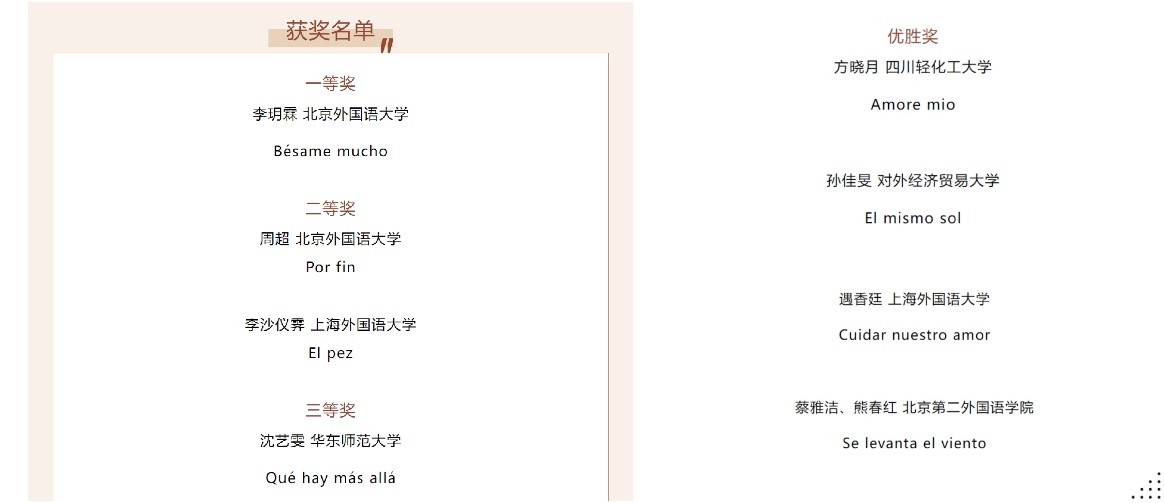 第二届全国西班牙语歌曲大赛获奖名单(来源:【北京外国语大学西葡语学院】公众号)