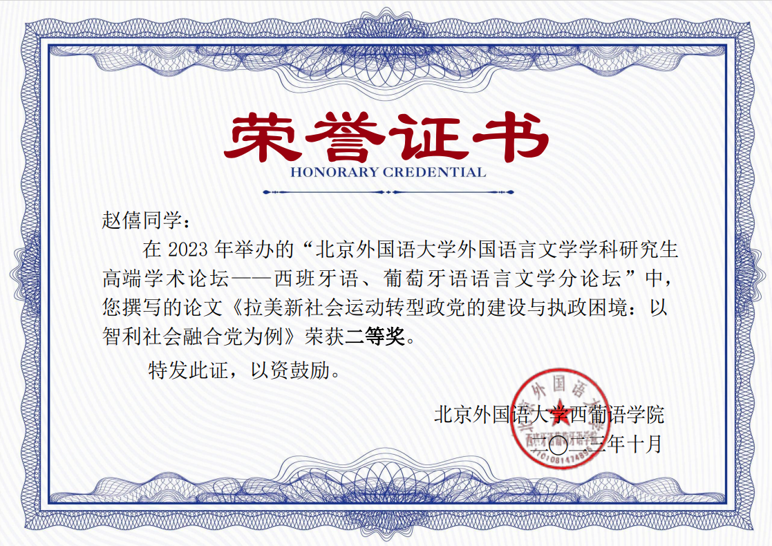 近期,我系西班牙语专业师生先后在多项学科竞赛中斩获佳绩。其中,西班牙语专业研究生刘蕊荣获第三十五届韩素音国际翻译大赛汉译西组一等奖。该项赛事由中国翻译协会、中国翻译研究院、当代中国与世界研究院与西安外国语大学联合主办,教育部中外语言交流合作中心支持,《中国翻译》杂志社、西安外国语大学高级翻译学院共同承办。本科生李沙仪霁和遇香廷由张敏老师指导,顺利进入第二届全国西班牙语歌曲大赛决赛,并最终取得二等奖和优胜奖的好成绩。该项赛事由北京外国语大学西班牙语葡萄牙语学院和北京交通大学语言与传播学院联合主办,来自全国40所高校的107个作品参加了初赛,其中15名选手晋级决赛。研究生赵僖和王皓由于漫老师指导,在北京外国语大学西葡语学院举办的“2023年北京外国语大学外国语言文学学科研究生高端学术论坛——西班牙语、葡萄牙语语言文学分论坛”中荣获二等奖和优胜奖。研究生黄颖和潘逸沁由于漫老师指导,斩获2023年中华笔译大赛全国总决赛西汉互译竞赛单元亚军和季军。此外,潘逸沁同学由张礼骏和陈旦娜两位老师指导,在2023外研社国才杯“理解当代中国”全国大学生外语能力大赛省赛西班牙语组中荣获优胜,顺利闯入国赛。