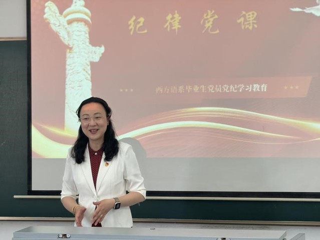 为贯彻落实中央和教育部开展党纪学习教育的通知精神,根据学校党委党纪学习教育实施方案和系党委具体实施计划,2024年5月10日,西方语系党委书记施海倩为系学生第一党支部毕业生党员上了一堂生动的“纪律党课”。