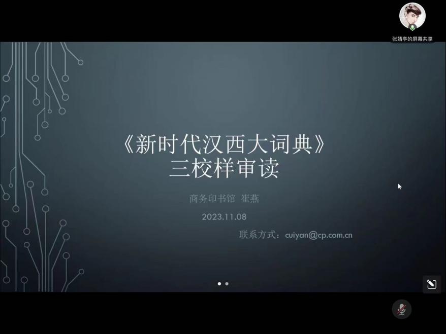 2023年11月8日,上海外国语大学西方语系线上召开本年度第二次《新时代汉西大词典》编撰工作会议。会议的主讲人为商务印书馆《新时代汉西大词典》责任编辑崔燕副编审,会议由西方语系教师张婧亭老师主持,2023级西班牙语语言文学硕士生全体参会聆听。