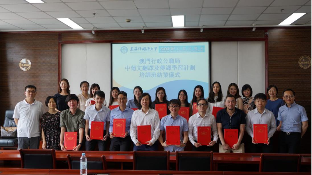 7月26日,由上海外国语大学西方语系承办的澳门行政公职局“中葡文翻译及传译学习计划”第三期培训项目在虹口校区正式落下帷幕。西方语系副主任兼葡萄牙语教研室主任徐亦行、国际文化交流学院副院长鹿钦佞、葡萄牙语教研室专业教师代表以及国际文化交流学院教师代表和15名学员共同出席了结业仪式。