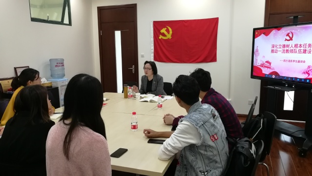 2019年10月15日中午,西方语系在松江校区3400室举行“不忘初心,牢记使命”主题教育集中研讨学习。本次集中学习围绕“深化立德树人根本任务,推动一流教师队伍建设”主题展开,上海外国语大学副校长张静与西方语系党政班子全体成员共同参与学习。