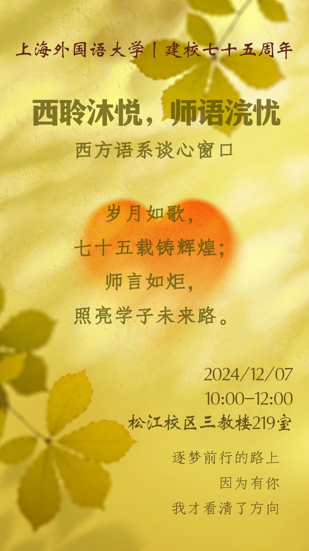 西方语系“西聆沐悦,师语浣忧”教授有约谈心窗口在入冬时节如约为你开启。今年恰逢七十五周年校庆,我系特邀曾为一代又一代西方语系学子指点迷津、引领成才的老教授、老教师们一同参与本次谈心活动。他们渊博的学问能让你感到知识的力量,他们丰富的阅历能为你拨云见日,他们开阔的眼界能催化你的成长,他们亲切的鼓励能助你充满力量继续前行。