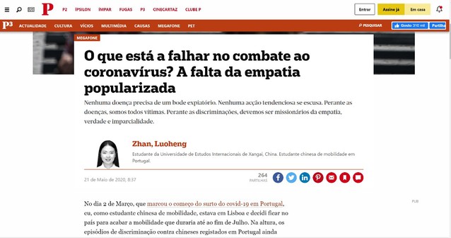 521日,西方语系葡萄牙语专业硕士研究生党员詹珞珩在葡最有影响力的报纸媒体《公众报》上发表葡语文章,题为“新冠之役,我们疏漏了什么?大众同理心的缺失”,对葡萄牙新冠疫情爆发期间个别排外、排华言论进行有力反驳,发表自己见解,为祖国发声。