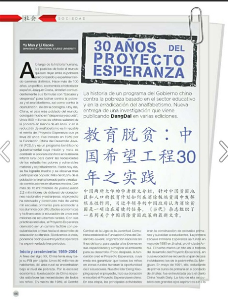 近日,上海外国语大学西方语系系主任于漫教授和2019级博士研究生李晓科在阿根廷学术期刊DangDai(《当代》)2020年第2期上发表论文“30 Años del Proyecto Esperanza(《教育脱贫:中国希望工程30年之实践》)。《当代》由阿根廷国会大学主办,一年四期,是阿根廷第一本致力于推动中阿文化交流的杂志,在阿根廷学界具有广泛影响