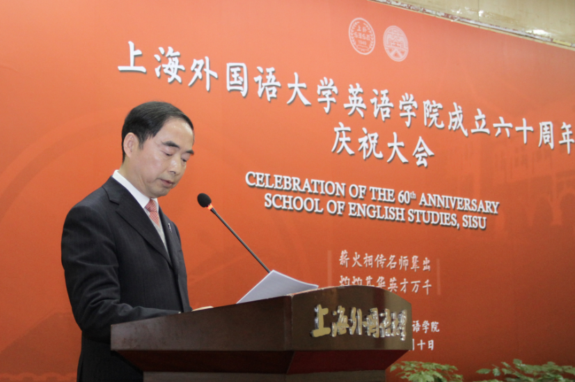 12月10日,伴随着喜庆欢快的音乐,上海外国语大学虹口校区内彩旗舞动、喷泉盛放,英语学院成立六十周年庆祝大会在第一报告厅隆重举行。上海外国语大学副校长冯庆华教授,上海外国语大学前党委书记、校长,英语系前系主任戴炜栋教授,上海外国语大学前党委书记、英语系前党总支书记吴友富教授,北京外国语大学英语学院院长张剑教授,以及来自校机关部处领导,兄弟院系党政领导,英语学院退休教师代表及全国各地校友等200余人汇聚母校,共度庆祝英语学院六十华诞。