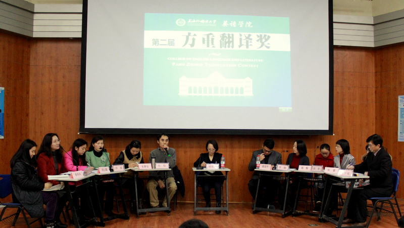 2012年12月5日,第二届“方重翻译奖”颁奖典礼暨口译辩论表演赛在松江校区图文东厅隆重举行。会场座无虚席,去年方重口译辩论表演赛的精彩场景至今为许多师生津津乐道,许多同学今年早早的来到了会场,期待欣赏比赛的盛况。校教务处副处长张廷佺老师、国际文化交流学院院长张艳莉老师、国际教育学院副院长聂薇老师、新闻学院副院长李美老师、传媒学院副院长朱晔老师、英语学院院长查明建老师、副院长刘全福老师、副院长许立冰老师、总支副书记徐丽云老师等出席了颁奖典礼。上海华为技术有限公司翻译中心经理汪洋女士、翻译中心编辑经理(英语学院97级校友)佟阿茹娜女士以及三十多位英语学院教师、三百多位来自各院系的师生也一同参与了活动。
