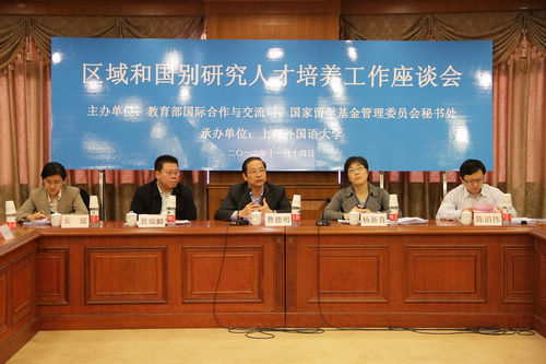 2012年11月14日下午2:00,由教育部国际合作与交流司、国家留学基金管理委员会秘书处联合主办,上海外国语大学承办的区域和国别研究人才培养工作座谈会在我校虹口校区会议中心召开。国家留学基金管理委员会副秘书长杨新育、教育部国际司专家处处长聂瑞麟、教育部港澳台办副主任安延以及国家留学基金委欧亚非部副主任陈滔伟等教育部领导出席了座谈会。