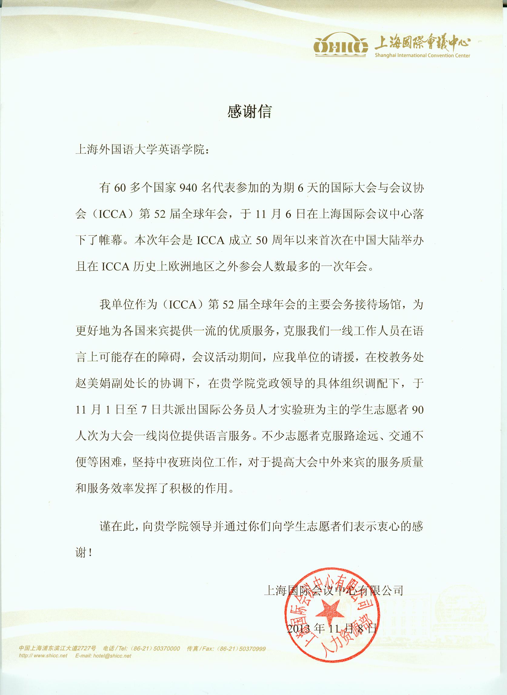 日前,上海国际会议中心发来感谢信,感谢我校志愿者为国际大会与会议协会第52届年会顺利举办提供的志愿服务。