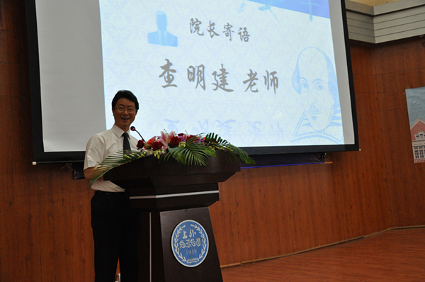 精心制作的开场视频用画中画的形式记录了四年英华令人难忘的大事纪:青青校树、热血球场、支教活动等熟悉的画面依次展开,引发了现场同学们的深深共鸣。随后,查明建院长首先代表学院为毕业生致辞。从2010到2014,对于每一个英华人,都是勇敢逐梦的四年。在致辞中,查院长娓娓道来英语学院人文化改革的努力与目的,更表达了对毕业生保持诗意人生境界和高尚的人生立意追求的寄望。在致辞结尾,查院长深情朗诵由2014届每一位毕业生的名字串成的诗词,传递着一位学者和师长对于学子们的关怀和期望。