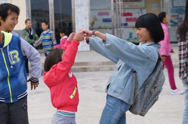 林佳红的公益之路是从小学开始的,那时她自愿报名前往敬老院陪爷爷奶奶聊天,高中时到福利院,和小朋友们一起玩耍,给他们送去欢乐和温暖。而进入大学之后,她说,“当时心中有满腔热情,想要服务社会,而且‘公益’二字本身就是对我的一种无形的号召,”于是就加入了英语学院的实践部——一个筹划组织志愿者活动参与公益事业的部门。在实践部认真工作的两年,她参与举办了华桥大赛(为公益项目提供资金的比赛)、发动了“纸盒去哪儿”活动鼓动大家废物利用,并参与了母亲节感恩特辑等众多活动。而除了策划志愿活动,她自己也在课余时间参与志愿者活动,包括“阳光之家”以及松江辅读学校(简称松辅)的志愿活动。在松辅,最令她印象深刻的是一个小女孩,一直拽紧她,要她坐旁边,于是她就静静地陪着她看书。她心心念念要当志愿者,给孩子们最踏实的陪伴,这是她做公益的初心。怀着这样不变的初心,她逐渐拓宽了自己的公益之路。后来,她愈加坚定了要去做支教的决心。而这个决定也是她认为的最重要并且是最正确的决定。