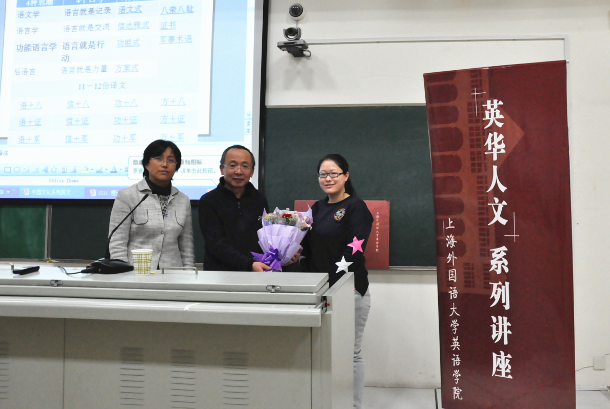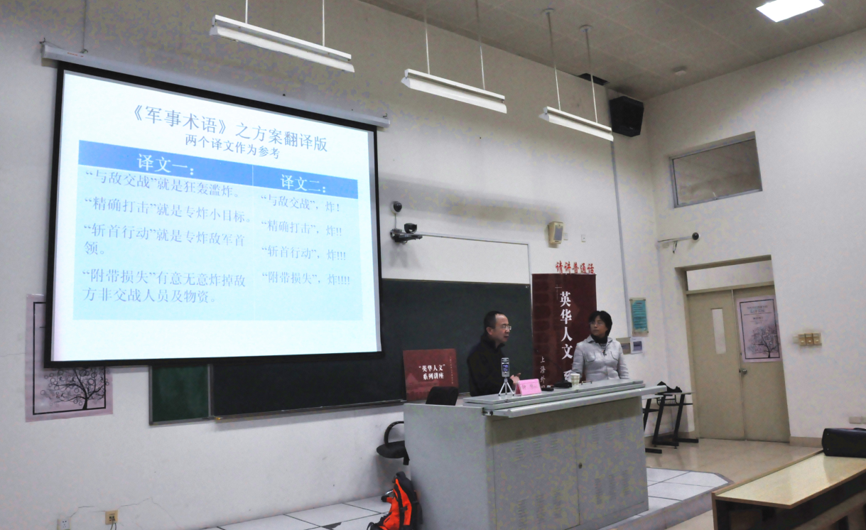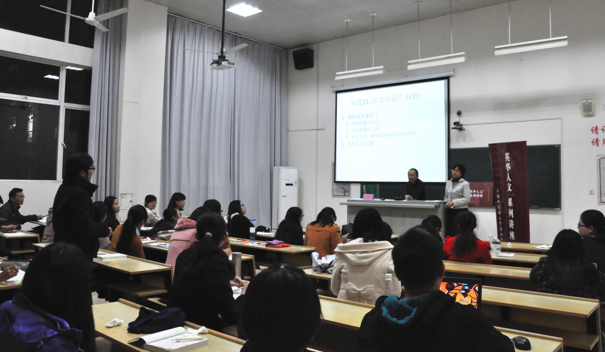首先,钟勇博士阐释了四种思潮之间的关系,他认为,“这四种思潮大致具有时间上的逻辑关系,彼此间具有继承和发展的内在联系。”通过生动的描述以及与学生的互动探讨,钟勇博士进一步地向大家阐述了各种思潮的内涵特征,所谓的“语文学”,类似于“硬译”、“死译”,执着于原句的文字、句子、语法,是最原始的翻译方式;而之后出现的“语言学”,更关注句子的整体结构和语言的沟通交流;再之后的“功能语言学”,则专注于提供信息,表达感情,表现创造力,如“吃了吗?”在语文学中译为“Have you eaten?”,而在功能语言学中可以译为“How do you do?”,因为在表达问候这个功能上,这两句话可以做到互相代替。“后语言”理论相对复杂而具有区别性,因为发展到这一环节的翻译理论在语言功能上明显减弱,不再强调“I speak English”而可能是“I am spoken by English”,像是网络语言等针对于某一特别人群运用的语言,是一种加诸于人的界限,而在这种形式里,语言具有了自身的力量。