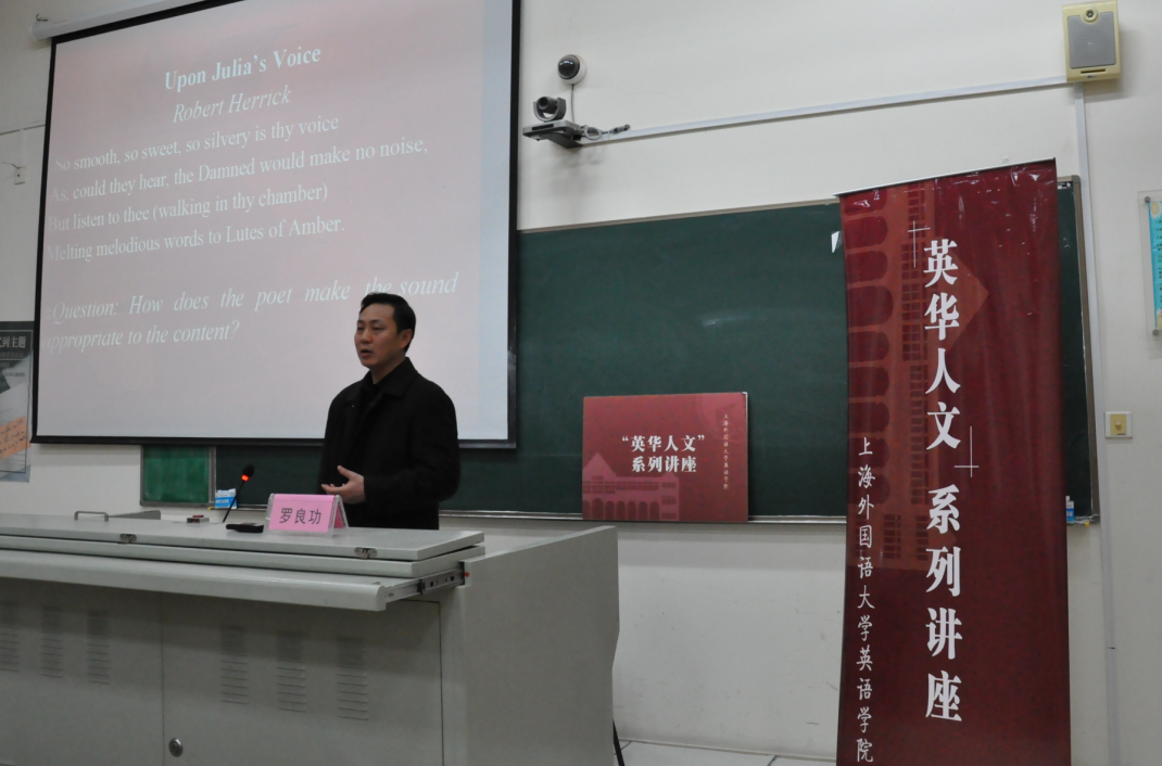 12月17日晚,来自华中师范大学的罗良功教授在英语学院为英华学子带来了一场精彩的讲座——讲座的题目为“从形式到主题:英语格律诗欣赏方法。”讲座为英华人文系列讲座第75讲,由英语学院副院长王欣教授主持。